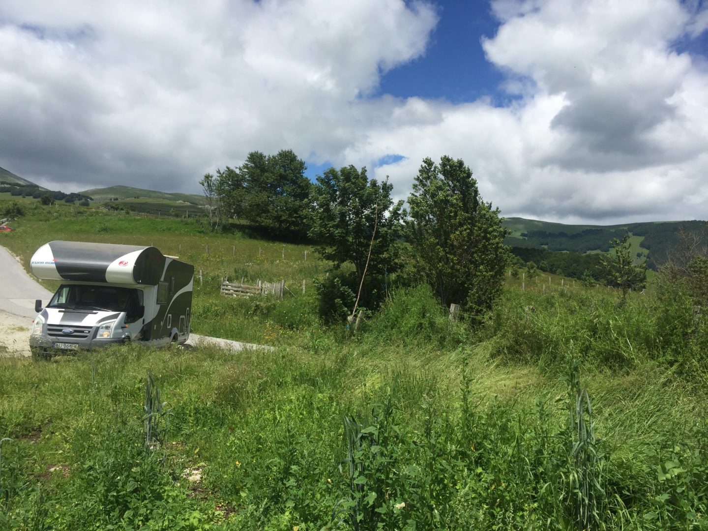 Park4night kieruje nas na wzgórza ponad miastem. Na swoim podwórku gospodarze prowadzący również warsztat samochodowy zrobili malutki parking dla kamperów. Zdjęcie powyżej to właśnie „nasz” widok na Sarajewo.