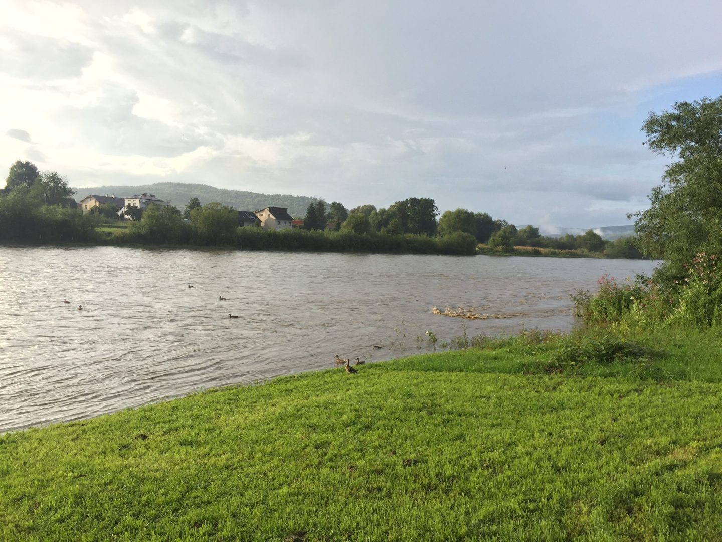 Przyszedł taki deszcz, że kamper z ledwością zaparkował na trawie. Ugrzęźliśmy i ani centymetra w jedną lub w drugą stronę, nie mówiąc już o wjechaniu na najazdy poziomujące. Tyrawka zaczęła już wpływać na kemping, nieopodal wdarła się do kurnika, a kilka kilometrów w górę zerwała kładkę. Ludzie we wsi z niepokojem obserwują rzeczkę, która stała się rwącym potokiem. Parkują samochody z dala od żywiołu.