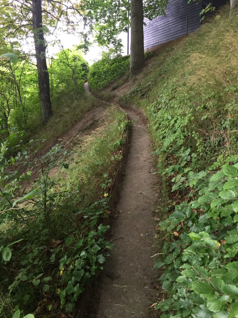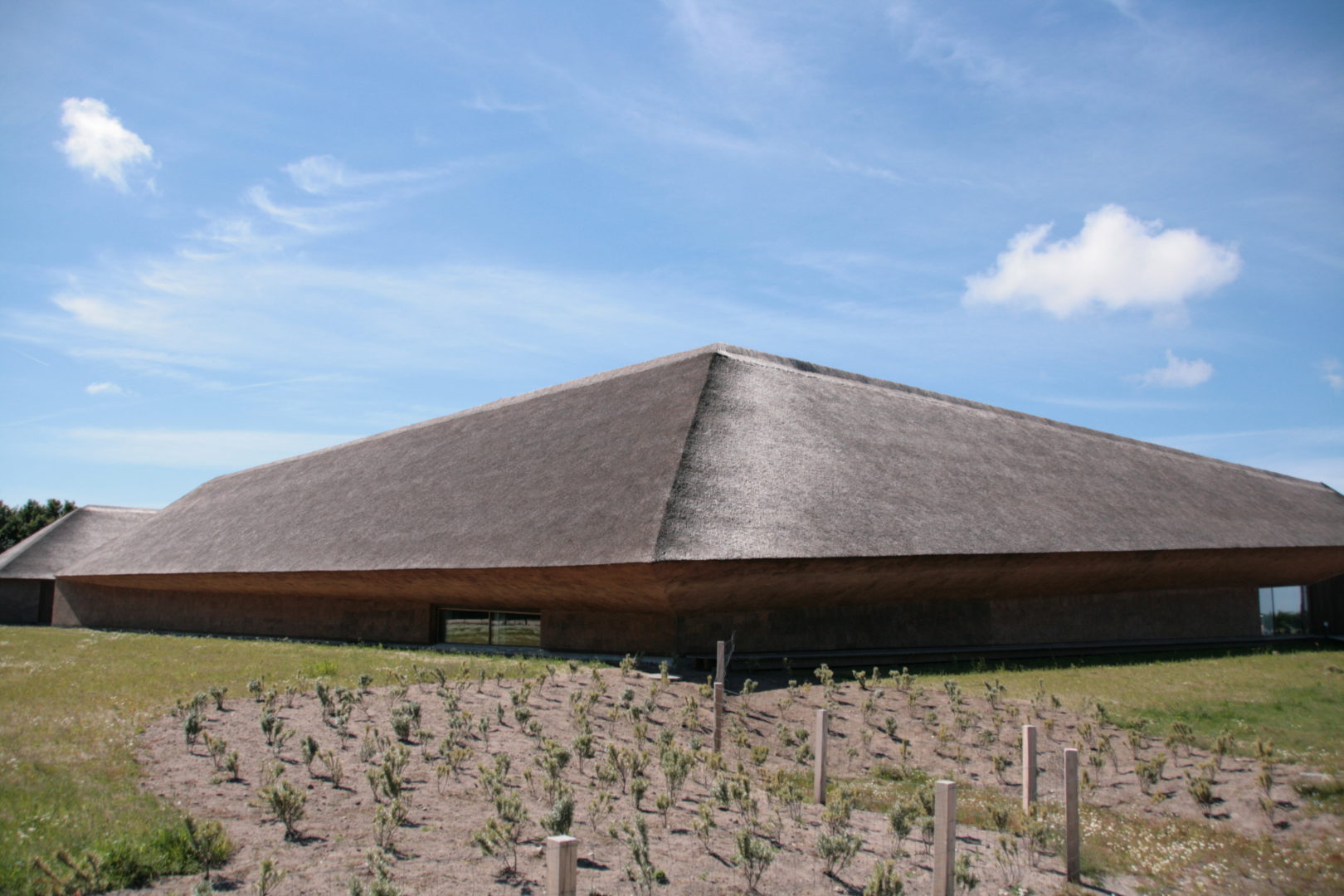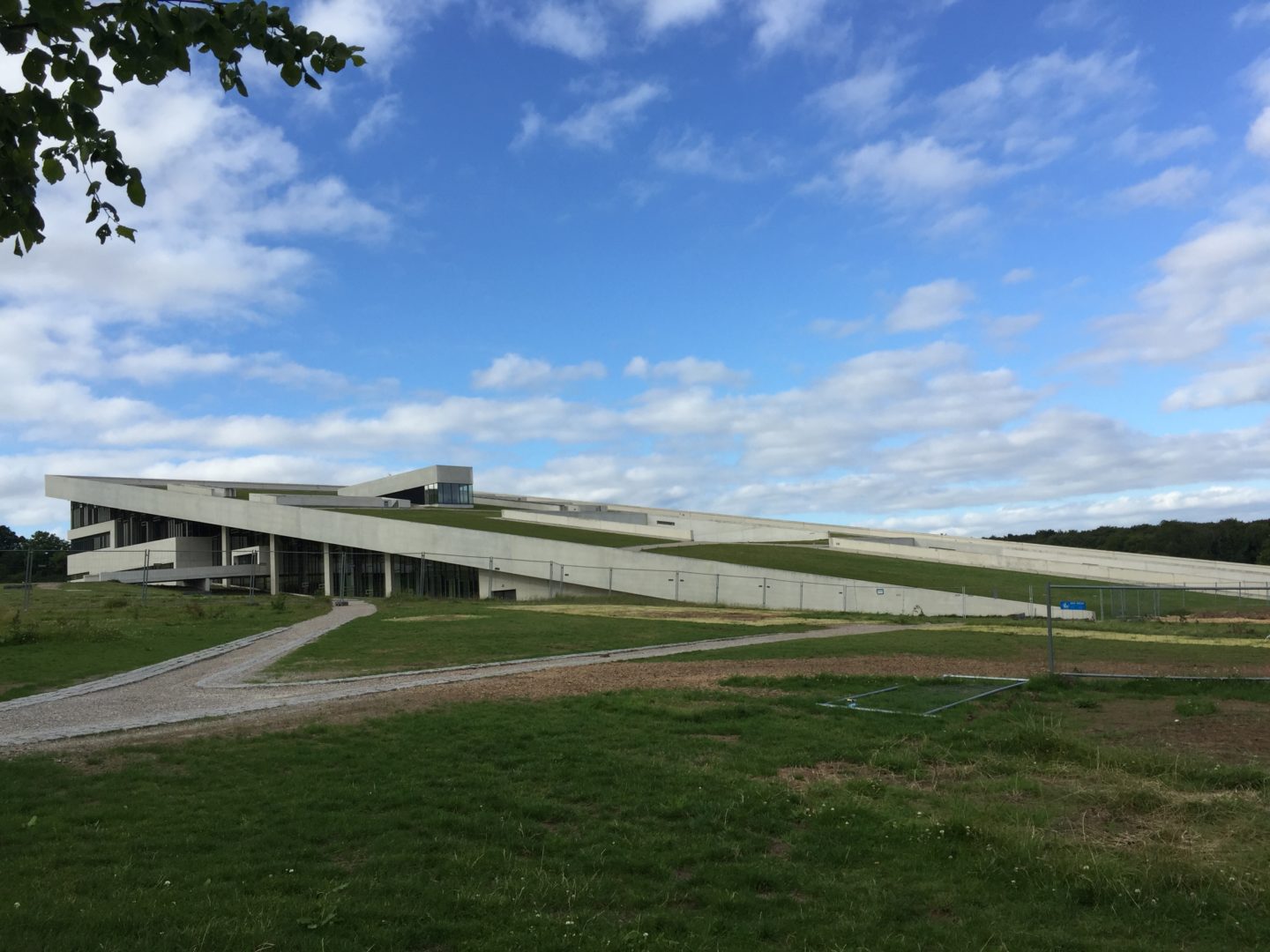 Ale po drodze jeszcze jeden punkt – budynek Moesgard Museum – kilkanaście kilometrów na południe od Aarhus. Prezentuje sztukę współczesną, jednak jest już późno, więc oglądamy tylko z zewnątrz … i z góry, bo na gmach muzeum można się wspiąć po trawie. Muzeum zlokalizowane jest obok budynków warsztatowych Akademii Sztuk Pięknych.
