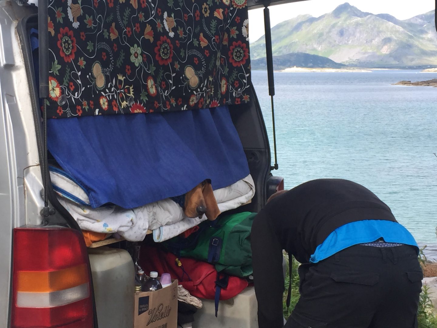 Jemy śniadanie patrząc na naszą rajską plażę za kołem podbiegunowym. Obok nas zaparkowali włoscy podróżnicy na espresso. Survival, survivalem, ale kawka się należy. Pan strasznie gada. Wychodzę, żeby zobaczyć o co mu chodzi. A on gada do psa…