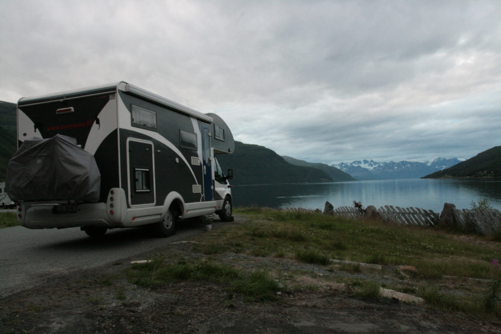 Stajemy na nocleg na rozległym placu parkingowym pod szumiącym wodospadem, nad fiordem z widokiem na ośnieżone góry. Żyć, nie umierać. Już dawno nie patrzymy ile stopni, z reguły 10 – 13. Ale w nocy nie jest dużo zimniej. Idzie się przyzwyczaić.