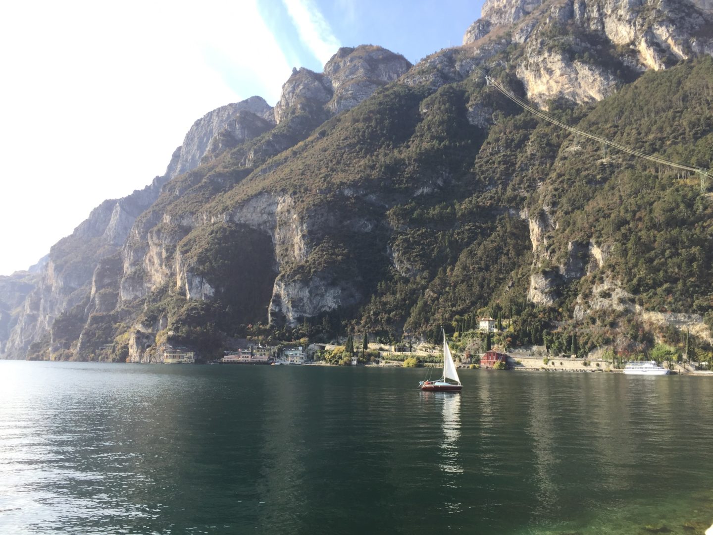 Jezioro Garda położone jest w pięknej scenerii wśród gór. Wyznacza ono granicę pomiędzy dwoma krainami Włoch: Lombardią i Wenecją Eugenejską. Jest największym jeziorem we Włoszech. A swoją popularność zawdzięcza niezawodnym wiatrom termicznym, które wieją praktycznie codziennie o zbliżonych porach, co przyciąga rzesze amatorów windsurfingu, kitesurfingu i żeglarstwa. Dla mnie jezioro jest przede wszystkim piękne, wycieczka wokół zbiornika, po drodze zbudowanej na skalnej półce dostarcza niezapomnianych wrażeń. Na dwudniowy pobyt wybraliśmy miasteczko na północnym krańcu – Riva del Garda. O tej porze roku ruch turystyczny nie jest już tak duży i można relaksować się w promieniach jesiennego, ciągle jeszcze ciepłego słońca. Wokół Gardy rozsiane są winnice i gaje oliwne, południowy brzeg to zarejestrowany rejon produkcji białego wina Lugano. Tak więc popić i pojeść będzie co, no i lody, wiadomo.