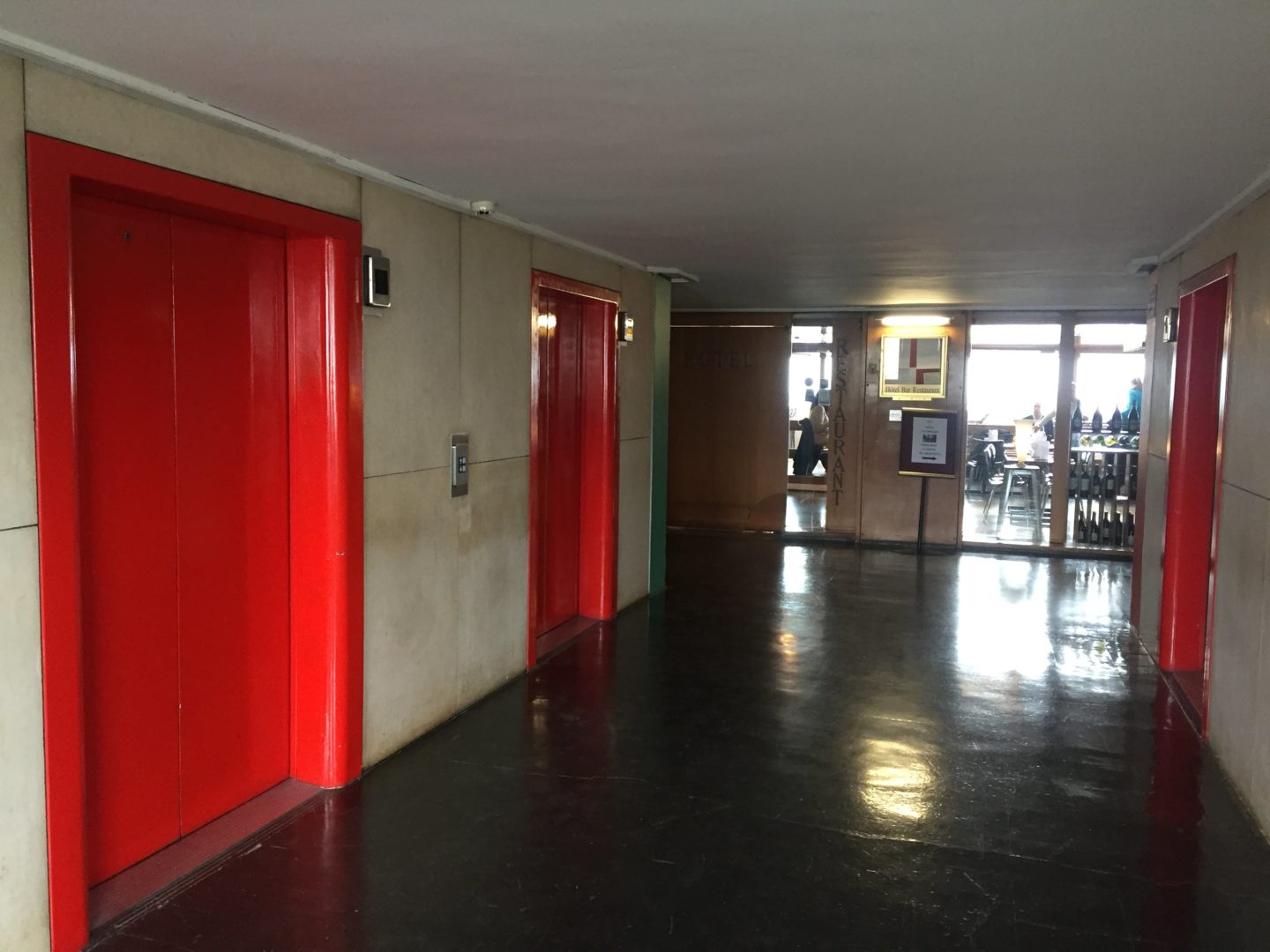 Pogoda nie wystraszyła chętnych na Le Corbu, to i mnie nie wystraszy. Wieje potwornie. Wokół bloczyska tworzą się jeszcze dodatkowe przeciągi. Ledwo idę i nie mogę otworzyć drzwi do budynku. W środku jest miło i ciepło. Korytarze są niskie i w podstawowych kolorach: czerwony, żółty, niebieski, zielony. Beton jest tu doprowadzony do perfekcji, on jest tu gwiazdą.